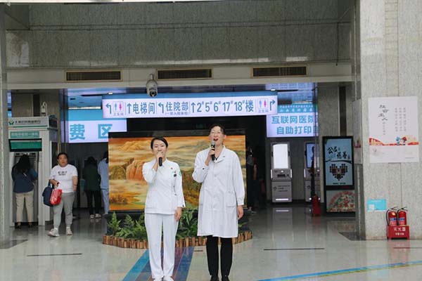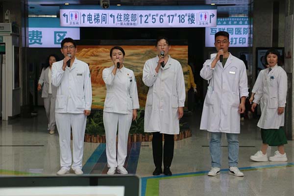 活动现场,医院青年职工、医护人员化身“歌者”,手持鲜花,以饱满的热情、动人的歌声,唱响主旋律 。歌声回荡在门诊大厅,传递出积极向上的青春力量,展现了医护人员的活力与担当,也为患者及家属带来温暖与慰藉,营造出充满人文关怀的就医氛围。此次活动不仅丰富了医院文化生活,更凝聚了青年力量,彰显了医院的青春风采与人文精神。