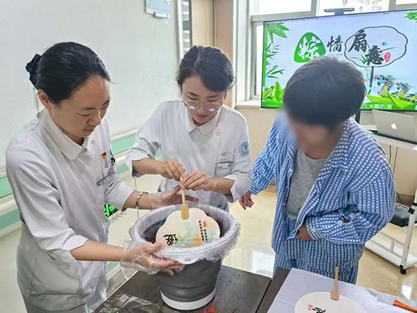 创意彩绘“寄心愿”:在护理团队的带领下,患者和家属们纷纷拿起画笔,在空白扇面上勾勒出自己心中的美好图案。不一会儿,形态各异的扇子在大家的巧手下焕发出新的生机,变成色彩斑斓、独一无二的艺术品。扇面上书写的“平安”“顺遂”等祝福语,不仅传递着对患者的美好祝愿,更承载着医患之间温暖情谊。