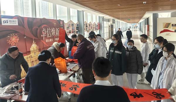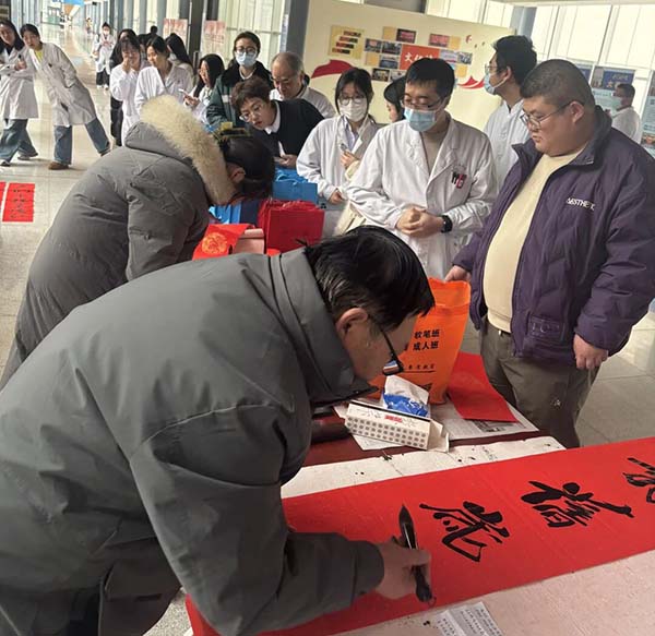 闻讯而来的医护人员有序等候、兴致盎然,或驻足一旁,静静欣赏书法创作的独特魅力,或与艺术家交流心仪的联句内容,现场欢声笑语不断,其乐融融。大家手捧刚写好的春联与福字,脸上满是喜悦,这份带着墨香的新春祝福,不仅是视觉上的美好享受,更让大家感受到了浓浓的节日温情。