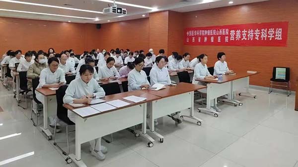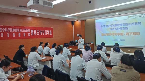 为筑牢肠内营养护理专业化根基,全面提升临床营养支持服务精准度与实效性,11月20日,中国医学科学院肿瘤医院山西医院(山西省肿瘤医院)护理部营养支持专科学组以“考核—分享—研讨—部署”四位一体模式,组织56名学组成员开展专题培训交流活动,围绕肿瘤患者营养护理新进展、实操技能与学科建设展开深度研讨,为优化临床营养服务明确路径。