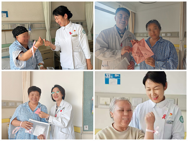 身着整洁白大褂的乳腺外科医护人员化身“粉红使者”,他们将象征爱与希望的粉红丝带系在患者手腕上。“好好康复,我们一起加油”,简单的话语与粉色丝带相呼应,传递出超越语言的力量。“这不仅是一条丝带,更像一份‘抗癌约定’。”现场一位患者轻声说道。