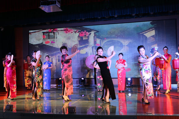 旗袍之美,宛如古典的花,盛开在时光深处,典雅而高贵。旗袍袅袅婷婷,演绎着专属于中国女儿家的情致,诗意玲珑,散发着专属于中国女儿家的风情。演出人员将婉约到极点的旗袍,演绎成符合现代潮流的服饰,完美展现东方女性体态美。20余位不同年龄的旗袍佳人,带着中国女性独有的魅力,点缀着我们自己的舞台。动起来,如一首宛转悠扬的歌摇曳于风中;静下来,则像是一幅婀娜杨柳的画安然于眸底,一颦一笑,一步一摇,成为此次汇演中一道亮丽的风景线。