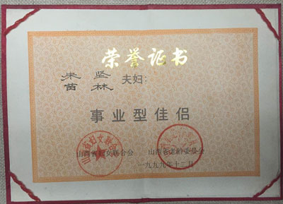 值得一提的是富有时代特征的苗林和朱坚夫妇的“事业型佳侣”证书,1999年由山西省妇女联合会、山西省老龄委员会颁发。