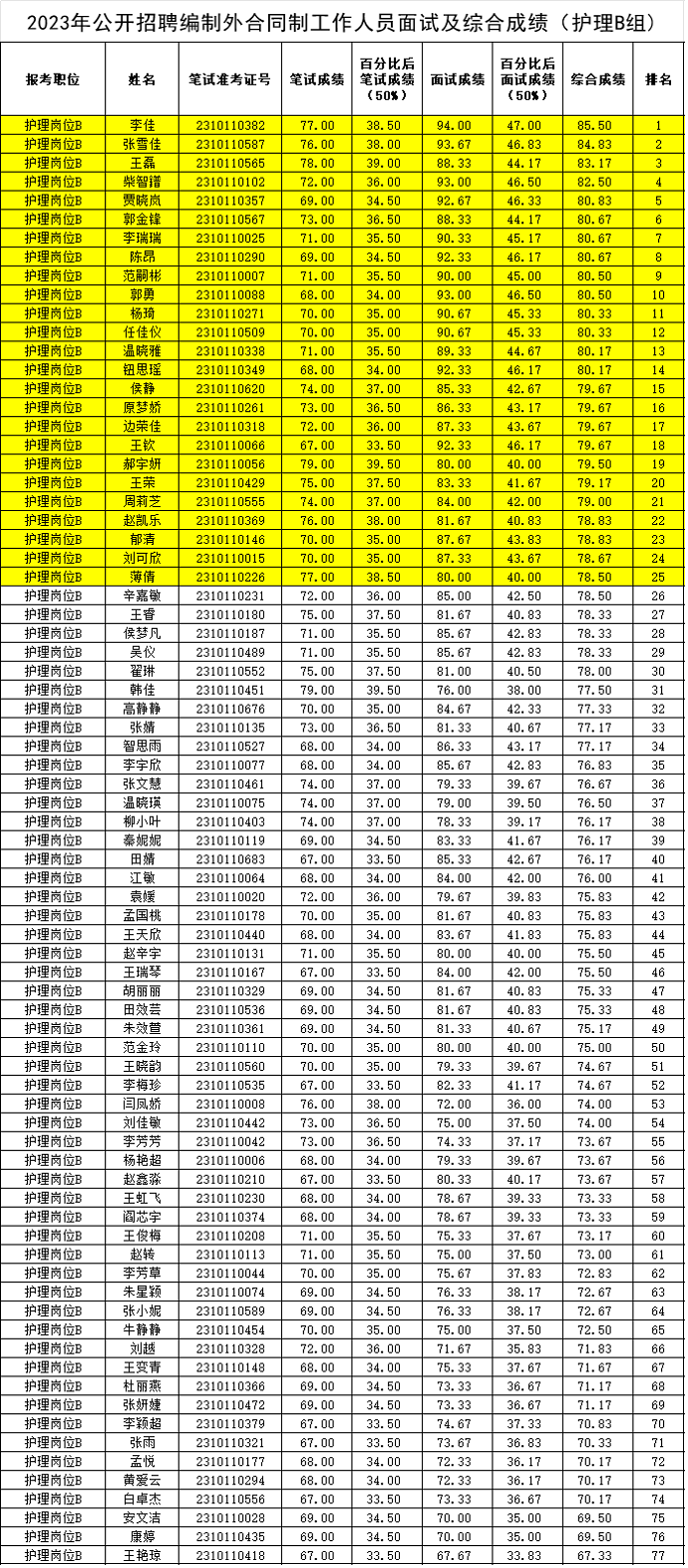 我院招聘编制外合同制工作人员面试工作已结束,现将综合成绩名单及拟入围人员(标注颜色者)公布如下。