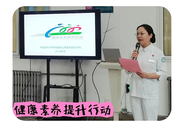 6 月 26 日,中国医学科学院肿瘤医院山西医院(山西省肿瘤医院)放射治疗科举办“提素养,促健康”健康素养宣讲活动。预防保健科副主任石樱桃(主持工作),预防保健科贾雅丽参加活动。放射治疗科15 名医护人员及近 40 名患者、家属参与其中。活动由胸部放疗二病区护士长刘小娟主持。