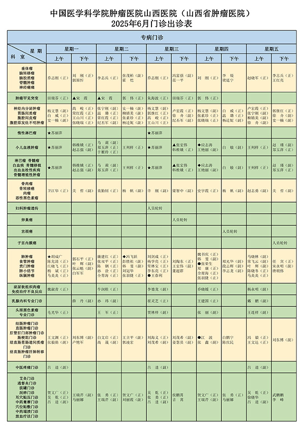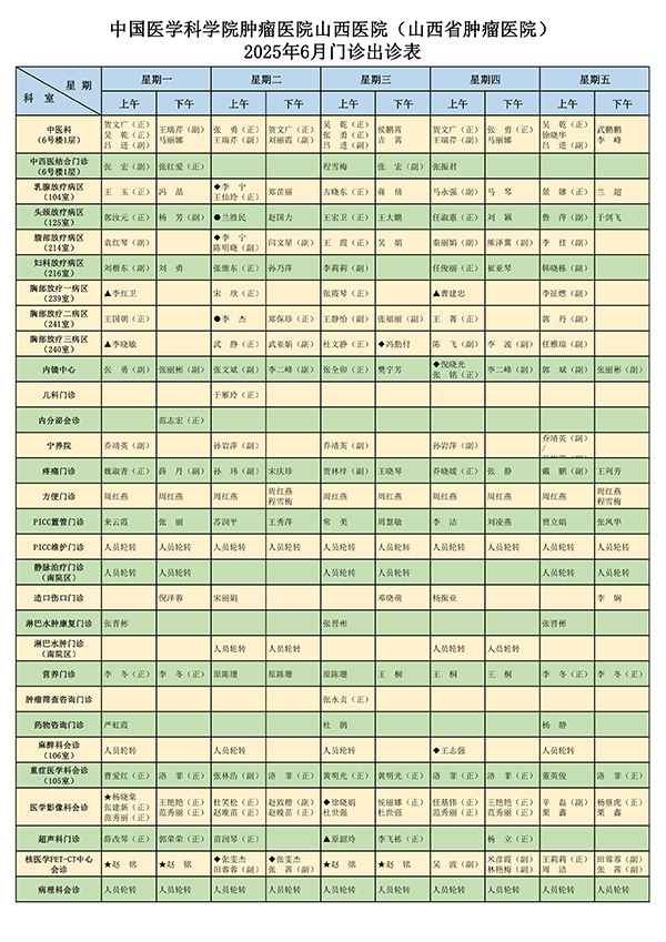 【通知公告】中国医学科学院肿瘤医院山西医院(山西省肿瘤医院)2025年6月门诊医师出诊表