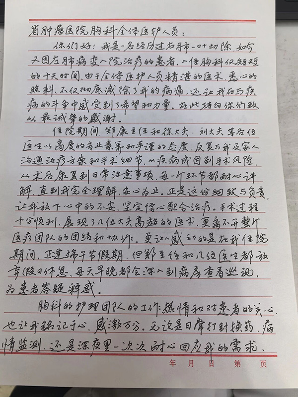 在电子通讯便捷的当下,手写书信的质朴愈发珍贵。郑康主任表示,团队将始终坚守“以患者为中心”的服务理念,把每一次沟通、每一次查房都作为传递温暖与信任的契机,用专业与温情守护患者的生命健康。医学从来都是科学理性与人文关怀交织的生命诗篇,而这两页信纸,正是对“有时去治愈,常常去帮助,总是去安慰”的最佳诠释。