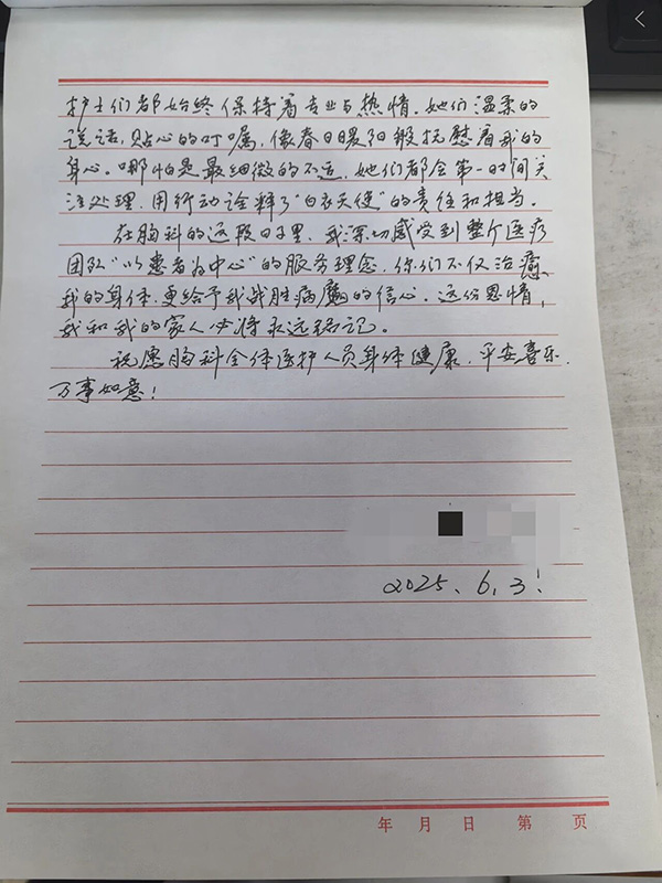 手术顺利完成后,最让患者感动的是端午假期的坚守。赵先生表示,“正逢端午,郑主任和医生们放弃休息,每天早晚都来病房查房,耐心解答我们的疑问。他们俯身倾听的姿态、口罩上方温暖的眼神,让我们全家都感到安心”。病区主任郑康感慨:“收到信的那一刻,所有的付出都值了。这是患者逐字推敲的心意,更是对我们专业与温情的肯定。”
