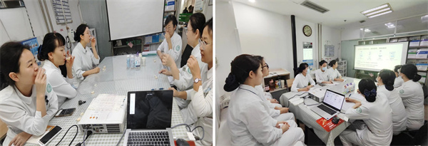 “闻味辨型、分层浅尝、交流分享”——沉浸式制剂体验是本次讲座的创新亮点。温雅护士长带领护理人员以“三步法”近距离感知不同制剂特性,将抽象理论转化为直观认知:通过嗅觉区分短肽型制剂的轻微腥味与整蛋白型制剂的清淡气味;模拟患者饮用场景,分别尝试原味、加热、兑水稀释等不同饮用方式,细致辨别浓稠度、口感及吞咽感受;随后围绕口感接受度、饮用注意事项展开热烈讨论,积累个性化指导的第一手素材。