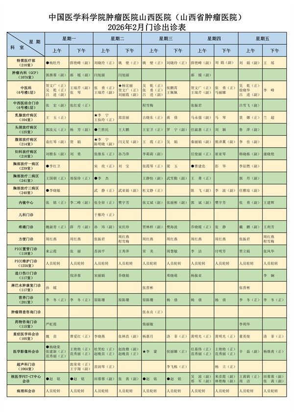 【通知公告】中国医学科学院肿瘤医院山西医院(山西省肿瘤医院)2026年2月门诊医师出诊表
