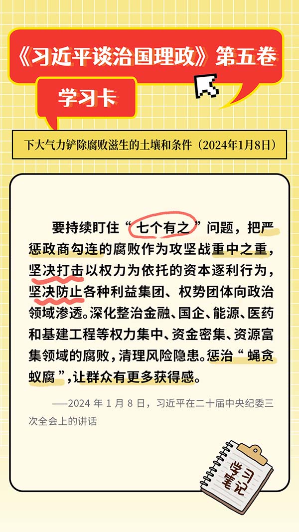 下大气力铲除腐败滋生的土壤和条件,是《习近平谈治国理政》第五卷深入论述的开展反腐败斗争的根本之道。持续保持惩治腐败高压态势,盯住“七个有之”问题、高悬惩治利剑,更是我们持续发力、纵深推进反腐败斗争的关键战略部署。那么“七个有之”具体指的是什么问题呢?一起来了解。
