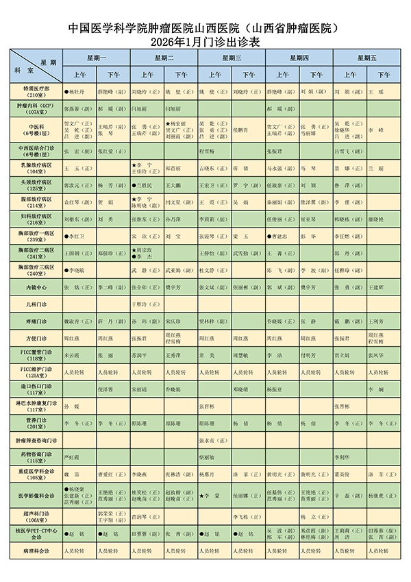 【通知公告】中国医学科学院肿瘤医院山西医院(山西省肿瘤医院)2026年1月门诊医师出诊表