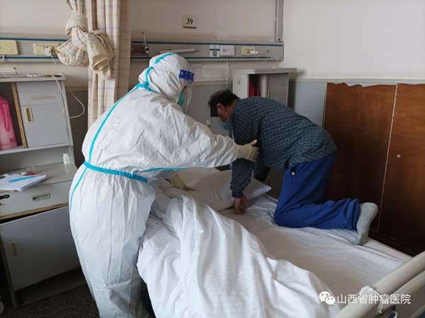 援沪任务已经开展将近一个月了,我熟悉了这里的环境,适应了这里的工作方式,医院里每天也发生着许许多多感人的故事。有一天,我刚接班,一位大爷眼里含着泪光,告诉我他的检查结果特别好,终于可以出院了,患者看到我身上的防护服写着“山西省肿瘤医院”,嘴里不停地说:“谢谢山西医疗队,谢谢山西医疗队!”那时,我们担心病人的心总算放下来,并且感到无比欣慰。随着定点医院救治工作紧锣密鼓的开展,许多患者陆续康复出院,我们严谨有序的安排患者出院。一位婆婆握住我的双手说:“姑娘呀,谢谢你们从那么远的地方来到上海,谢谢你们,你们辛苦了!”同病房的人也竖起了大拇指。婆婆的话触动了我的心弦,想到了家中年迈的奶奶,鼻子一酸眼含泪花。