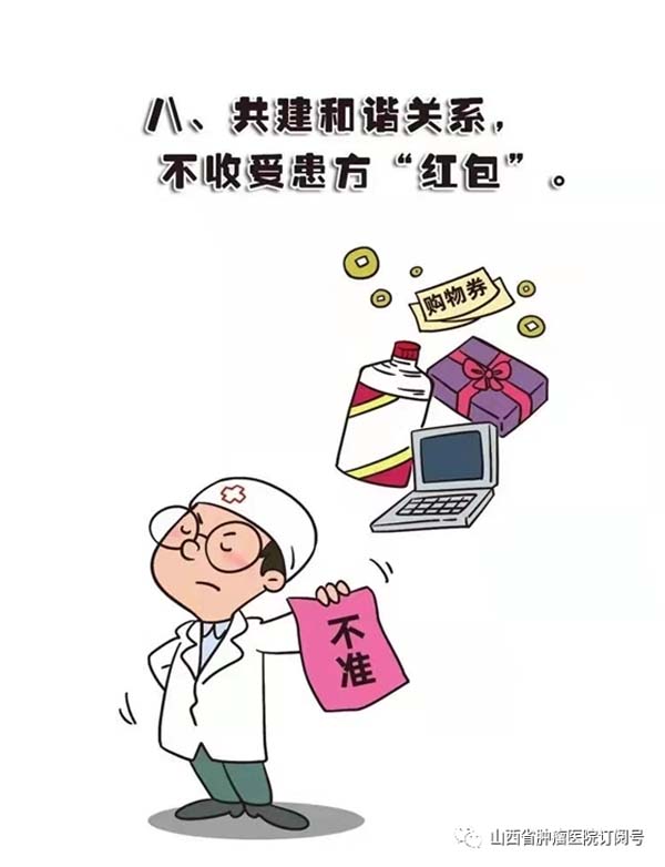 恪守医德、严格自律。严禁索取或者收受患者及其亲友的礼品、礼金、消费卡和有价证券、股权、其他金融产品等财物;严禁参加其安排、组织或者支付费用的宴请或者旅游、健身、娱乐等活动安排。